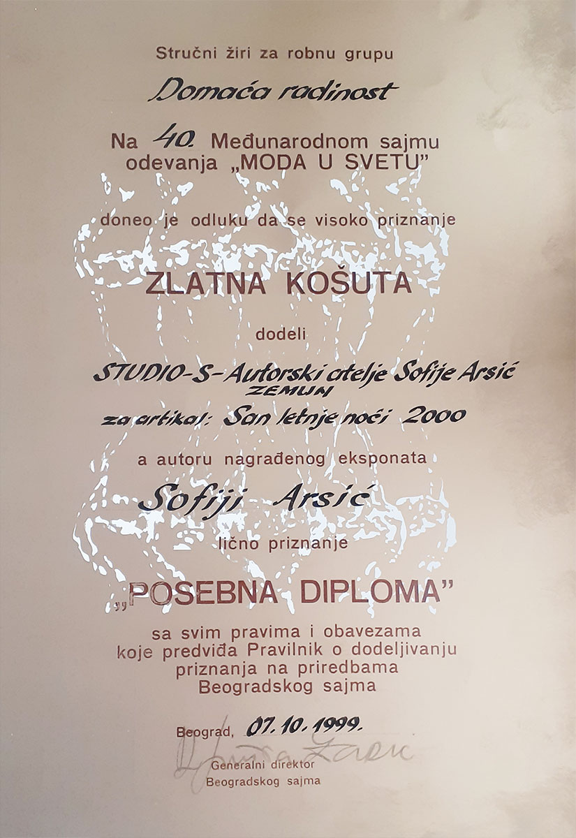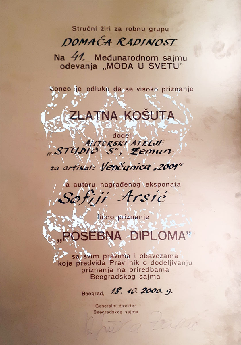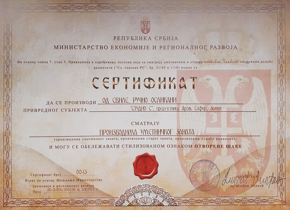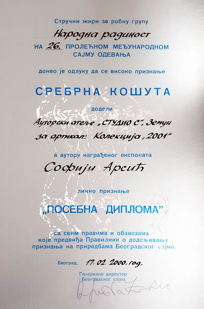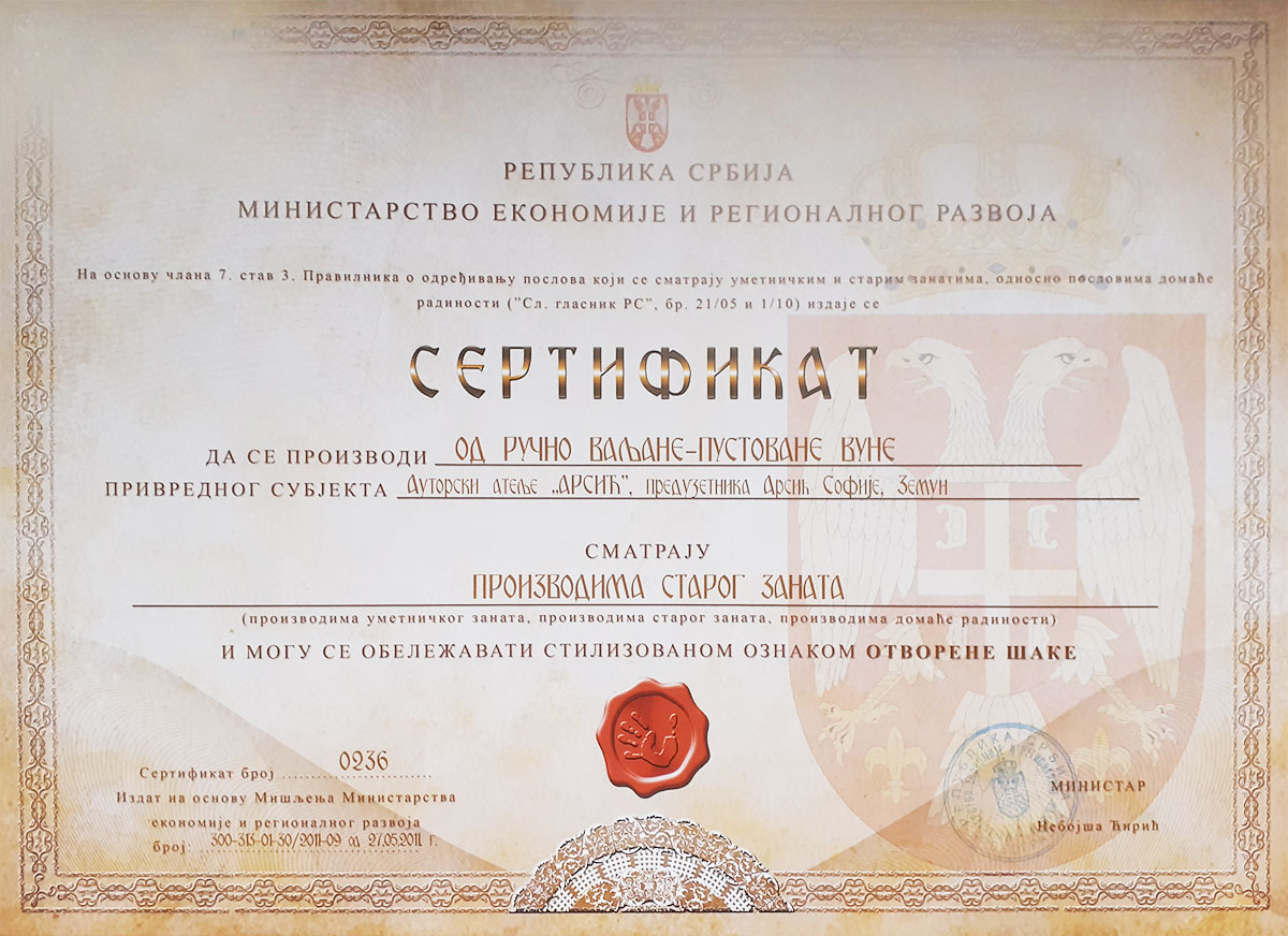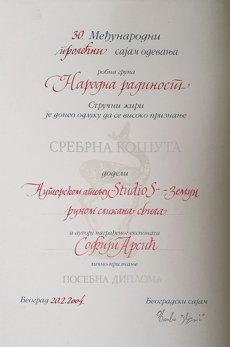 Atelje je nosilac znaka 'otvorene šake' zbog negovanja tradicionalnog načina izrade proizvoda.